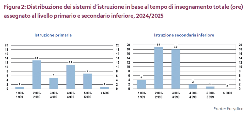 Nella metà dei sistemi d’istruzione la scuola primaria prevede almeno 4.000 ore di insegnamento, mentre per la scuola secondaria inferiore ciò avviene solamente nei tre sistemi (Germania, Lituania e Slovacchia) in cui questo livello di istruzione ha una durata complessiva di cinque anni.